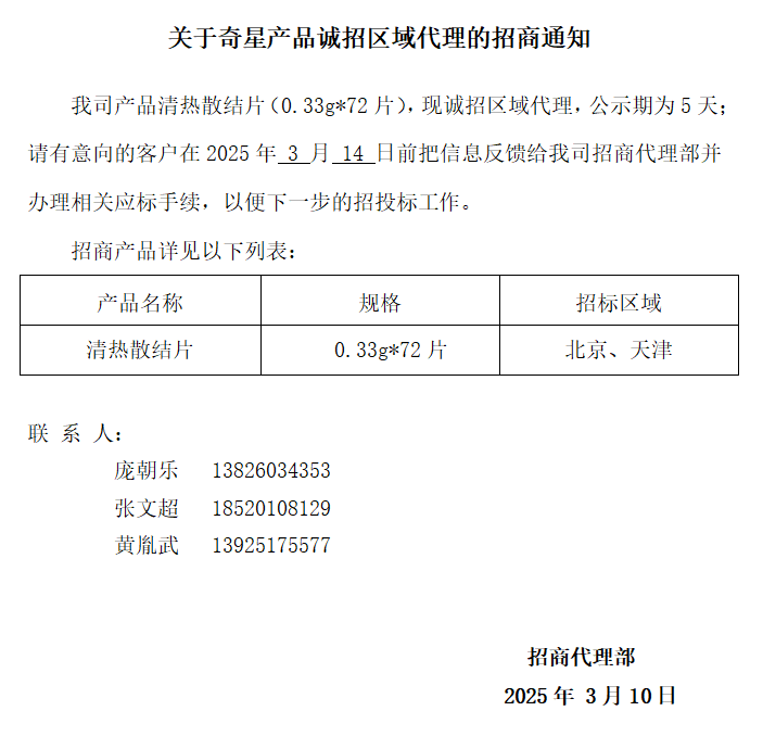 關(guān)于奇星產(chǎn)品誠招區(qū)域代理的招商通知